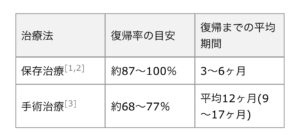 復帰までは一般的に数ヶ月〜1年程度かかります。また、手術治療の方が復帰まで時間がかかります。