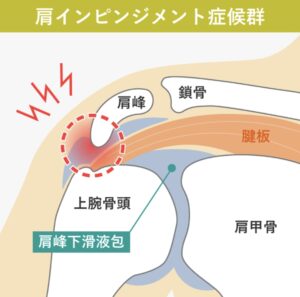 ○肩の関節を構成する骨同士が衝突したり、骨の間に筋肉が挟まれて、痛みが生じる状態です。
